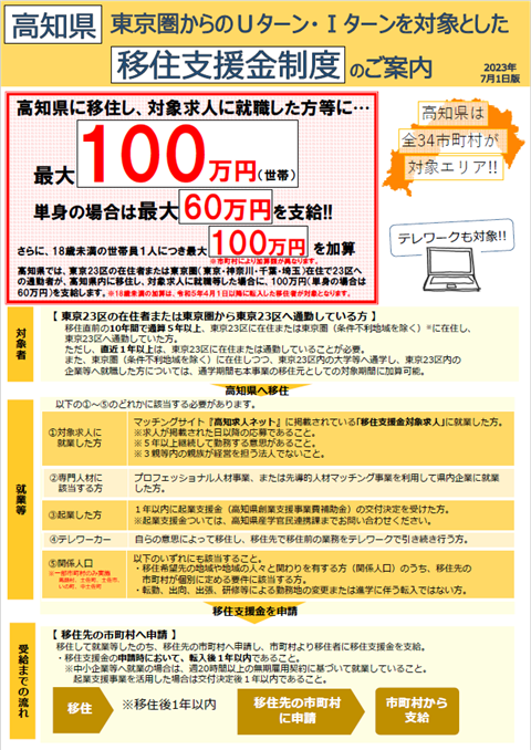 高知県へ移住し、対象求人に就職した方等に最大100万円(世帯)、単身の場合は最大60万円を支給